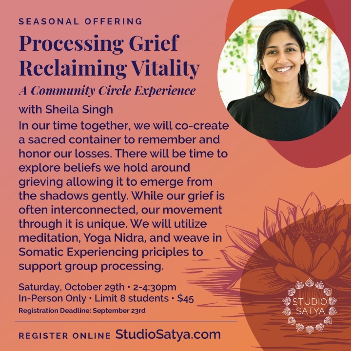During this workshop we will recruit the power of community in our processing of grief. I will be weaving together principles from yoga, non-dual philosophy, and Somatic Experiencing™, as well as practices of meditation and iRest® yoga nidra to support our process.